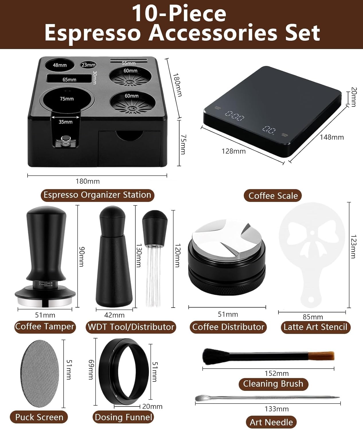 | Included Components | WDT Tool, Espresso Tamper, Tamping Station, Coffee Distributor, Dosing Funnel, Puck Screen, Latte Art Pen,Stencils & Coffee Scale |