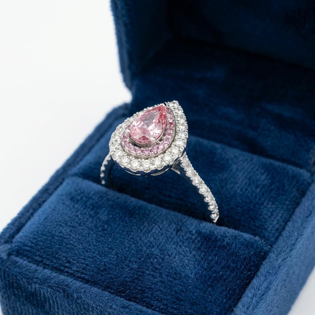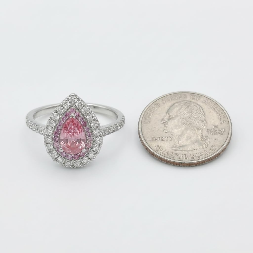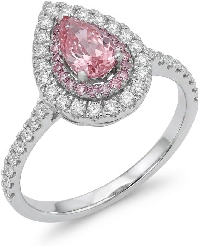 This exquisite 14K white gold ring showcases a stunning natural pink diamond in a pear shape, designed to deliver elegance and brilliance. The center stone is surrounded by a double halo of pink and white diamonds, enhancing its color and creating a radiant sparkle from every angle. The accent diamonds are meticulously arranged to provide depth and contrast, giving the ring a luxurious and eye-catching appearance. With E color and VVS1 clarity, the diamonds offer exceptional brightness and a near flawless look. Crafted in solid 14K white gold, this ring is designed for lasting beauty and comfort. Its distinctive design makes it an ideal choice for engagements, anniversaries, or collectors of fine jewelry.