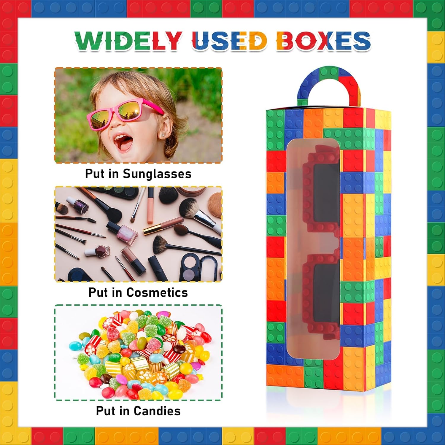 Specifications: Material: Cardboard, PVC, PC, Paper Size: block party goodie boxes: 7.48×2.91×1.89 inches (19×7.4×4.8 cm) Shipping Mailer Box :12.60×8.66×1.54inches(32×22×3.9cm) Color: colorful Package Includes: 24 x block party goodie boxes 24x building bricks party sunglasses 24x shipping mailer box This block party decoration is suitable for various occasions, including building block parties, birthday parties, game parties, gift-giving parties, etc. You can use these boxes to pack candies, snacks, small prizes and gifts. You can place them in every corner of the party to create an interesting party atmosphere NOTE: Glasses do not offer UV protection!