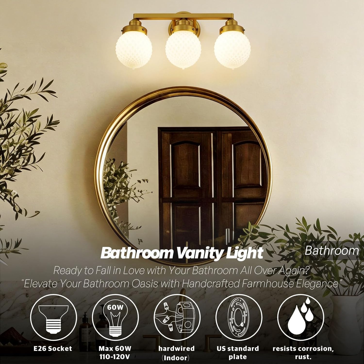 At LOOMLUSTER, we believe light is more than illumination—it's the soul of a space. Born from a passion for interior elegance and uncompromising details, each fixture is crafted as an architectural element where form, feel, and function unite. This 3-Light Wall Sconce embodies our founder Fenny Feng's philosophy, blending elegant design with premium light quality to breathe life into your home. Unlike standard lighting, each opal glass shade is hand-blown, resulting in a unique texture and a diamond-like surface that catches light beautifully. The thick, heavy material ensures durability while providing that sought-after soft, diffused illumination that eliminates harsh shadows—ideal for flawless makeup application at your bathroom vanity lights over mirror or creating a cozy reading nook in the bedroom. We’ve paired the delicate glass with a substantial solid aluminum frame in a rich champagne bronze finish. This isn't just a gold lamp; it's a statement piece. The meticulous polishing and wire-brushing process locks in the color, making this brushed gold bathroom light fixture resistant to tarnishing and corrosion—a perfect choice for modern bathroom light fixtures where moisture is a concern. It coordinates beautifully with gold bathroom accessories and gold bathroom mirror frames to create a cohesive, luxurious look. Whether you are remodeling your bathroom decor, updating your black vanity light to something brighter, or seeking the perfect lighting for your hallway, this fixture adapts. Its unique aesthetic bridges vintage charm and modern minimalism, ensuring it complements rather than competes with your existing vanity lights for bathroom. From the gentle glow over the kitchen sink to the elegant statement above the living room console, let LOOMLUSTER transform your house into a home. Specifications: Material: Solid Aluminum & Brass-Finished Metal; Shade: Hand-Blown Thick Milk Glass; Socket: UL Listed E26 (Max 60W); Installation: Hardwired; Damp Rated: Yes