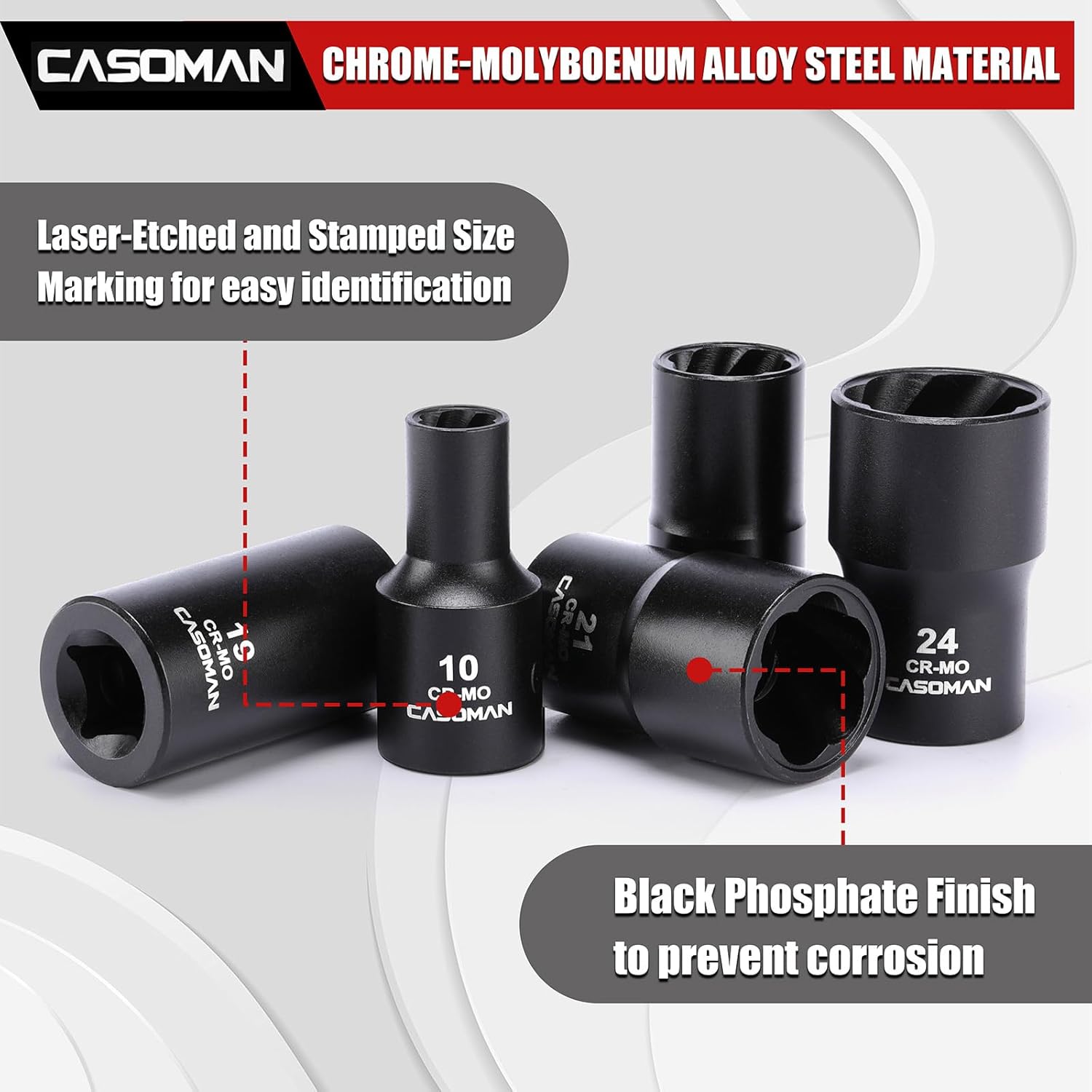 This 16-Piece 1/2" Drive Impact Bolt & Nut Extractor Socket Set is an ultimate solution for removing your damaged, rusted, or stripped fasteners. Its reverse spiral flutes design helps sockets bite for maximum gripping power—the more you turn, the tighter the socket grips. Made from drop-forged and heat-treated chromium-molybdenum (CR-MO) steel construction, these impact-grade sockets withstand extreme force, while the black phosphate finish resists corrosion for long-lasting durability. Laser-etched markings and color-coded rings ensure quick size identification, even in low-light conditions—making this set a must-have for professionals and DIYers tackling tough jobs.