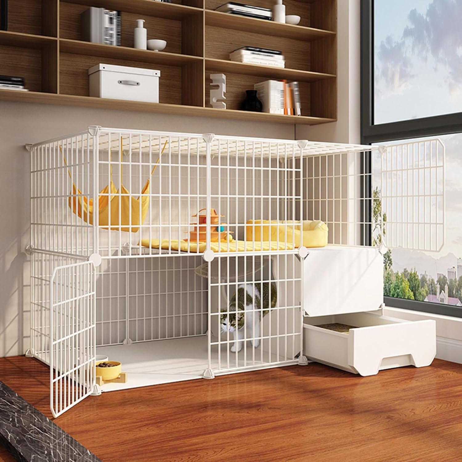 ✔The GUAWJRZDP cat cage has a large space inside, where cats can move freely and jump up and down.✔The interior decoration can be DIYed by yourself to create a comfortable home for cats.✔The closed cat litter box is convenient and practical, which can not only isolate odors, but also exercise the kitten's toilet ability.✔The cat cage has a metal frame, and the internal platform is a metal + resin double-layer structure, which can bear a load of about 20kg.✔The iron mesh is encrypted all around, which is convenient for observing the cat's dynamics, and the air permeability is better, getting rid of the summer heat.♥Product parametersProduct name: Metal cat cageStyle: Modern and simpleMaterial: Metal + PP resinColor: WhiteSize: 75x39x73cm (29.5x15.3x28.7in),75x39x109cm (29.5x15.3x42.9in),111x39x73cm (43.7x15.3x28.7in)Purpose: Pet rest, sleep, playInstallation method: Self-assembly☑Purchase instructions:①This product needs to be assembled by yourself.②Due to manual measurement, there will be a 1-3cm error in the product size.③Due to differences in display parameters, there may be differences in color, please refer to the actual product.