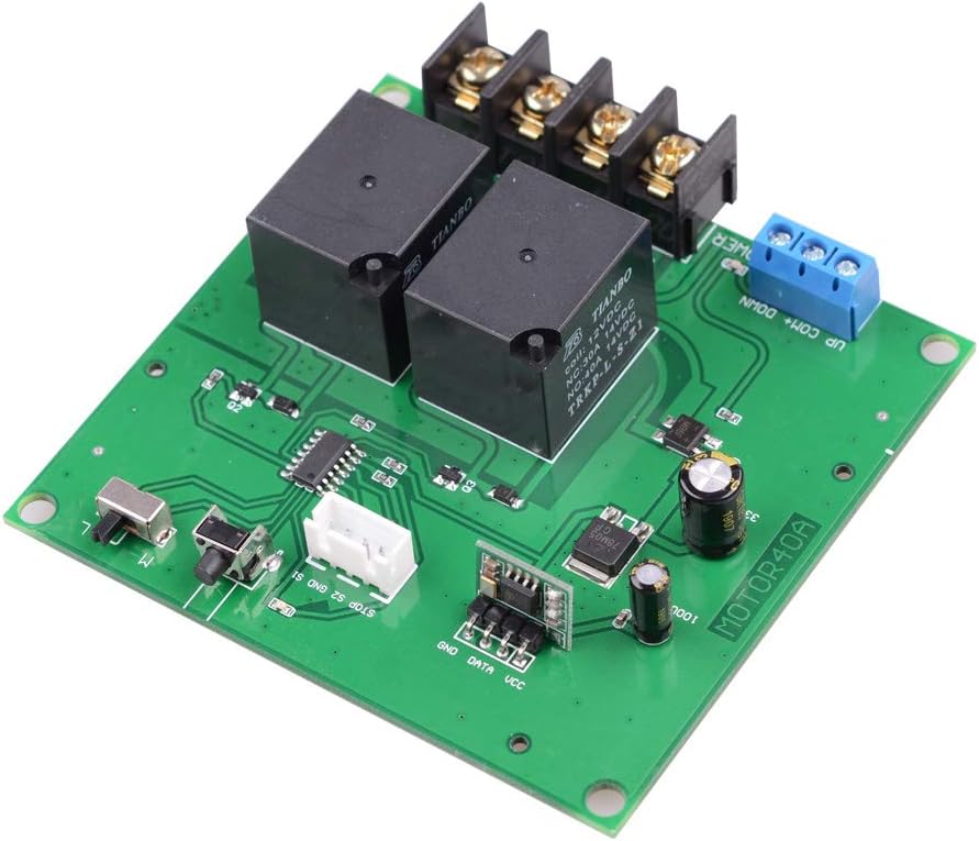 About Receiver:Working Voltage: DC12V Max Load: 40A Relay (have better load less than 300W) Working Mode: Momentary Latched adjusted by DIP Switch Momentary----Switch turn to“M" Latched---Switch turn to " L" Momentary---Press button"Up", the Motor Forward, Release is Stop. Press button "Down", the Motor Reverse, Release is Stop. Latched--- Press button "Up", the Motor Forward, Press button "Stop" is stop. Press button "Down", the Motor Reverse, Press button"Stop" is stopWhen the receiver output state is “Latched”, we have set it 2S time delay for forwards and reverse, it is the Protection function.How to wire to your External Manual Button (if you need)Forward ---S2 & GNDReverse ---S1 & GND Stop---Stop & GNDAbout Limited Switch Function: Limited Switch use UP,DOWN and COM+ Terminal ,Your limited switch connect COM and NC .(Limited Switch is not included ) About Learning Code: 1. Press the learning button on the receiver for 1 time,the learning indicator ON,Then press the transmitter button up for 1 time (first button default for forward) ,the learning indicator flash 2 times and ON,It mean the first button learning Successfully 2. Then press the transmitter button down for 1 time (second button default for reverse) ,the learning indicator flash 2 times and ON,It mean the second button learning Successfully 3. Then press the transmitter button stop for 1 time (third button default for stop) ,the learning indicator flash 2 times and ON,It mean the third button learning Successfully 4. Then press the transmitter button stop for 1 time again,the learning indicator flash 2 times and OFF,It mean all button learning Successfully About Learning Code: Press the learning button on the receiver for 5s,the learning indicator will flash 3 times and OFF , It mean all the transmitter code in the receiver have been cleared.Package Include: 1 x Receiver 1 x Transmitter