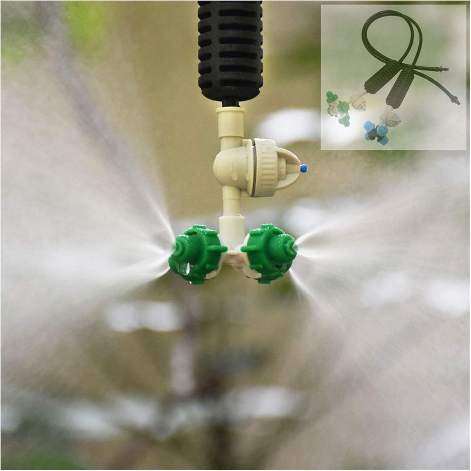 Easy to use-connect the water connector to the connector100% brand new product descriptionMaterial: environmentally friendly plasticProduct: Hanging mist nozzleConnection size: 1/4 inch barbPacking: 10 sets10 cross nozzles10 0.5 m 1/4 inch hoses10 "optional" anti-drip valves10 1/4 inch barb connectorsPressure: 1.5-3 kgFlow rate: 35-40L L / HSpraying radius: 0.9-1.2 metersUses: Mainly used for fruitless, seedling irrigation, garden flowers watering and greenhouse coolingnote:The size is measured manually, please allow slight measurement errors.