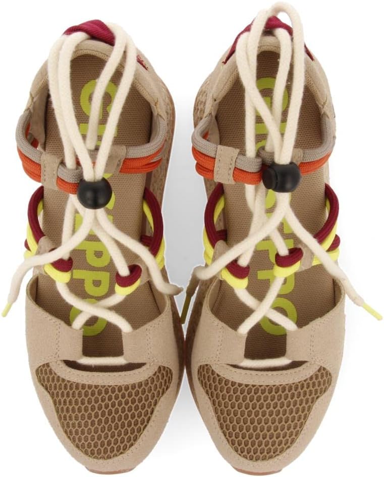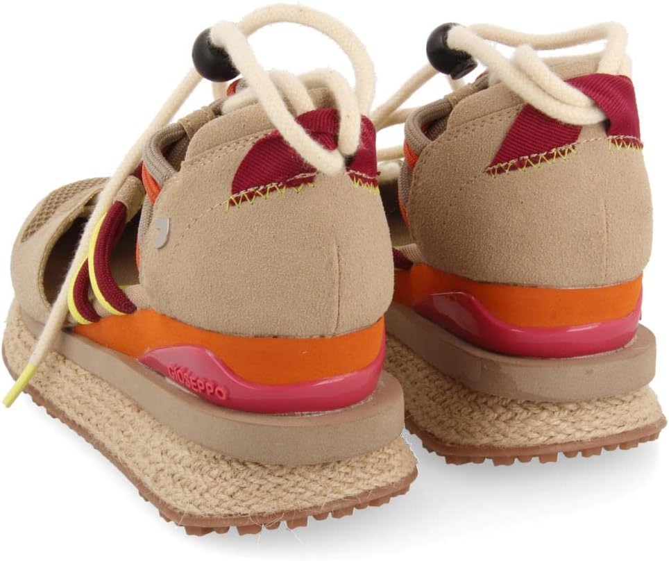 We reinvent a classic Gioseppo! Beige espadrille sneakers combined with strings of different vibrant tones, external EVA wedge, in EVA floor with variety of reliefs and lined in jute. Padded insole for added comfort. Breathable recycled polyester lining and insole. Discover the latest casual sandals of the season in the new Gioseppo Woman collection.