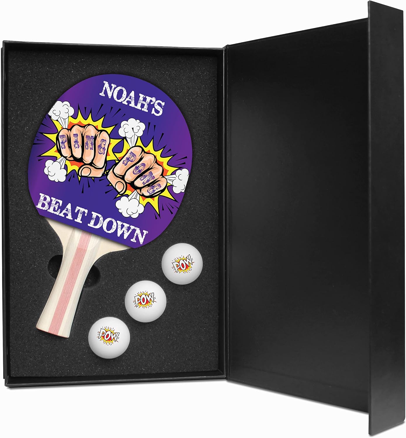 Whether adding to your table tennis set or offering as a trophy gift, this paddle gift set features a decorative design and personalized name for a special touch. It has an ergonomic handle and rubber strike surface for smooth gameplay.