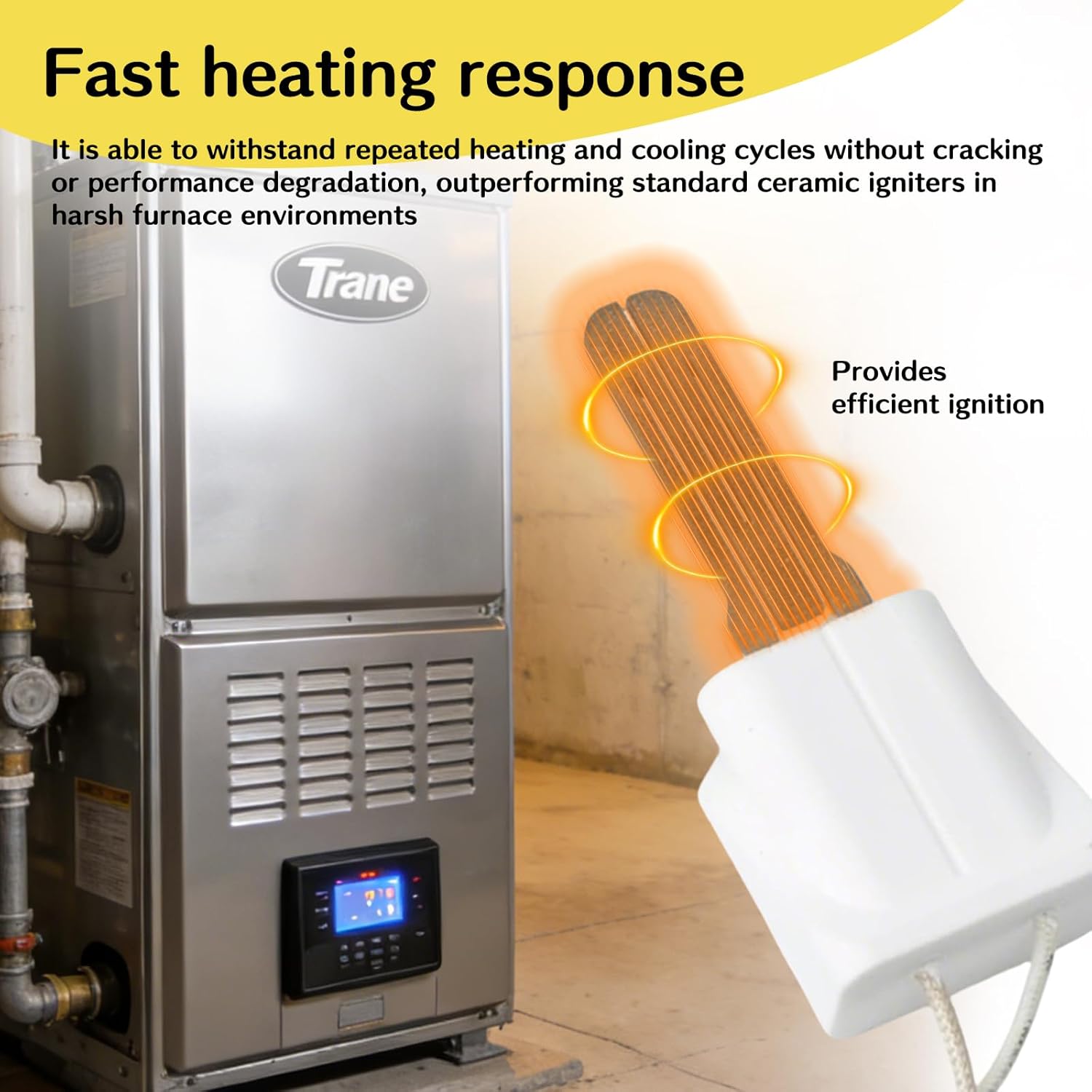 Compatible Models: This high-quality hot surface igniter is a perfect substitute for Trane,compatible with Trane furnace YCD15, YCD17, YCD18 series Replace: KIT03033, AF3033, KIT-3033, DS010KX. Durable Material:Constructed with premium silicon carbide, this igniter features exceptional thermal shock resistance and fast heat-up capabilities. It can withstand repeated heating and cooling cycles without cracking or degrading, outperforming standard ceramic igniters in harsh furnace environments. Reliable Quality: The advanced silicon carbide design allows the igniter to reach ignition temperature quickly, reducing the time your furnace spends in pre-heat mode. This not only cuts down on energy consumption but also minimizes wear on other furnace components, extending the overall service life . Easy Installation: Simply shut off the furnace power, disconnect the old igniter’s wires, remove the mounting screws, install the new KIT03033, and reconnect the wires—no professional HVAC expertise required.