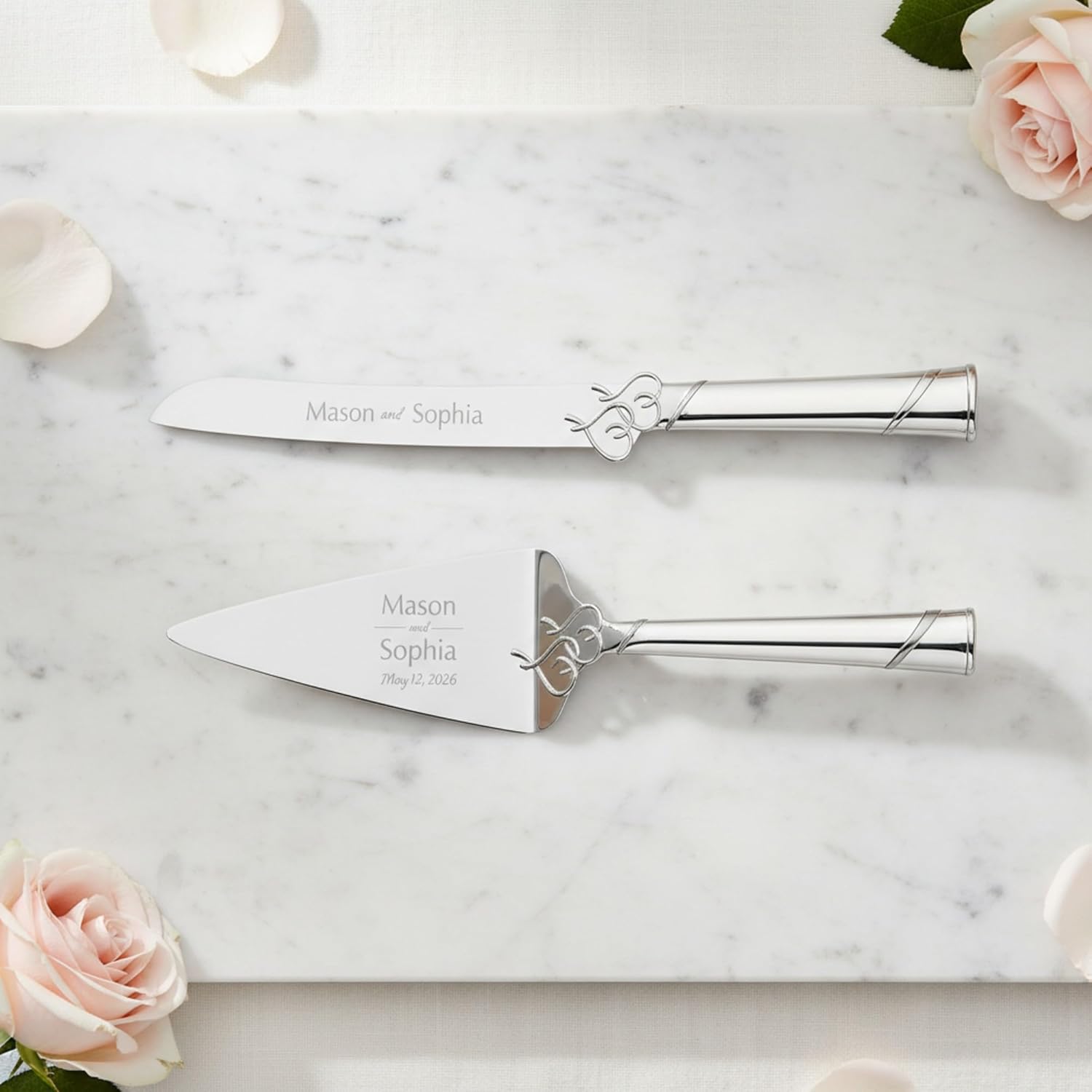 LENOX TRUE LOVE PERSONALIZED WEDDING CAKE CUTTING SET Romance beams from the True Love Wedding Cake Knife and Server Set by Lenox. Featuring a pair of interlocking hearts that are carefully etched on the handles, this playful yet chic dessert set fits perfectly with nearly any wedding theme. Durably crafted of silver-plated stainless steel, the 13" cake knife and matching 12" server have a nice, heavy weight and feature a beautiful mirror polished finished that is sure to look stunning in wedding photos, and become a wedding keepsake that can be cherished for years to come. INCLUDED ENGRAVING SERVICE For the perfect finishing touch to this most important keepsake, our team will customize each set purchased with a custom engraving. Choose from our menu of stylish design templates and provide the names and wedding date for your special couple to appear in the fonts and layouts shown. Alternatively, select the custom text option, choose a font style, and add any text of your choosing to the cake knife and server. Click 'Customize Now' to begin your order and review engraving options. ITEM SPECIFICATIONS Manufacturer: Lenox Model: True Love Dessert Set Model Number: 812615 Knife Length: 13" Server Length: 12" Material: Silver Plated Stainless Steel Raised Interlocking Heart Motif Lenox Gift Box Packaging