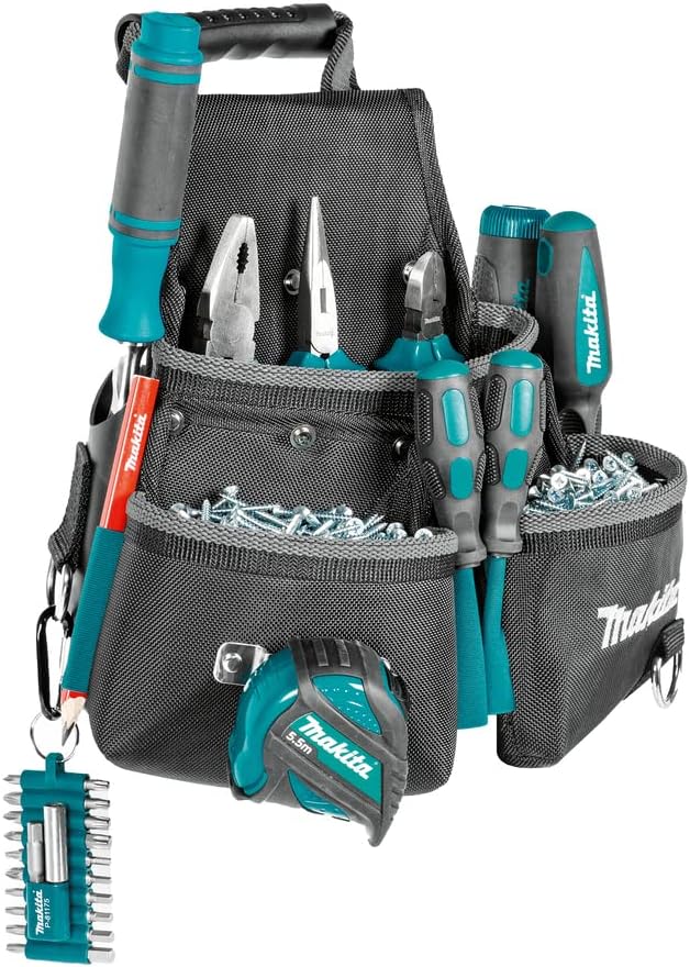 Makita is the leading manufacturer of professional power tools on the market. Introduction to Makita durable rivets; Makita durable rivets ensure unbreakable strength. Rivets attach two or more pieces of material giving ultimate strength for some of the toughest jobs. Reinforced seams ensure long-lasting quality for products that are exposed to heavy weight. Rivets are made of stainless steel; strong, one-piece self-punching rivets with washers that are used in all high wear areas ensuring solid protection and long life. The additional washers are used for greater strength, used on one side or both sides. The E-15207 Ultimate 3 Pocket Fixing Pouch is made of 1680 denier polyester with strong industrial stitching for added durability and longer life, durable rivets with washers for extra strength and non-slip webbing with rubber surface on top to avoid slipping and falling. The E-15207 is equipped with 3 spacious pockets for a variety of tools and fasteners; ideal for nails, screws, pencils, parts and more, 2 genuine leather tool holders, multiple pockets and sleeves for convenient organization and genuine leather chisel holder with additional rivets to protect the blade. Elastic tool holders inside the pocket on the back panel to keep tools upright and secure, elastic tool loops on the side for practical utensils and tape measure stainless steel holder for any construction tape from 3 meters to 10 meters. E-15207 has a metal D-ring for hanging tools and accessories for quick and easy clip storage and can be worn on any Makita tool belt or regular clothing belt. Length 320 mm, height 270 mm, width 145 mm, capacity 3.3 litres.