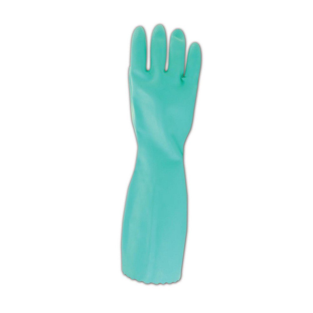 Mapa unlined chemical resistant glove. Unique Z-pattern grip provide secure handling of hard-to-grasp items. Ultra-long chemical protection. Optimized service life. Excellent mechanical resistance (abrasion, perforation). Excellent protection during intensive handling of high-risk chemical products. Applications: Automotive/mechanical industry: treating/degreasing metals with aggressive solvents; Chemical industry: handling drums of chemical products; Mechanical industry: etching/degreasing; Other industries: application of pesticides, cleaning of printing-press rollers, maintenance. Certificate of conformity and regular production inspections on the manufacturer's premises by the notified bodies. Mechanical Hazards EN 388 (performance levels): puncture resistance, tear resistance, blade cut resistance, abrasion resistance. Specific Chemical Protection EN 374 (Chemical product): methanol, n-heptane, sodium hydroxide 40 percent, sulphuric acid 96 percent. Wrist: straight cuff. Interior finish: chlorinated. Exterior finish: embossed texture. Size: 8. Green color. Measures 14-inches length by 0.022-inches thickness.