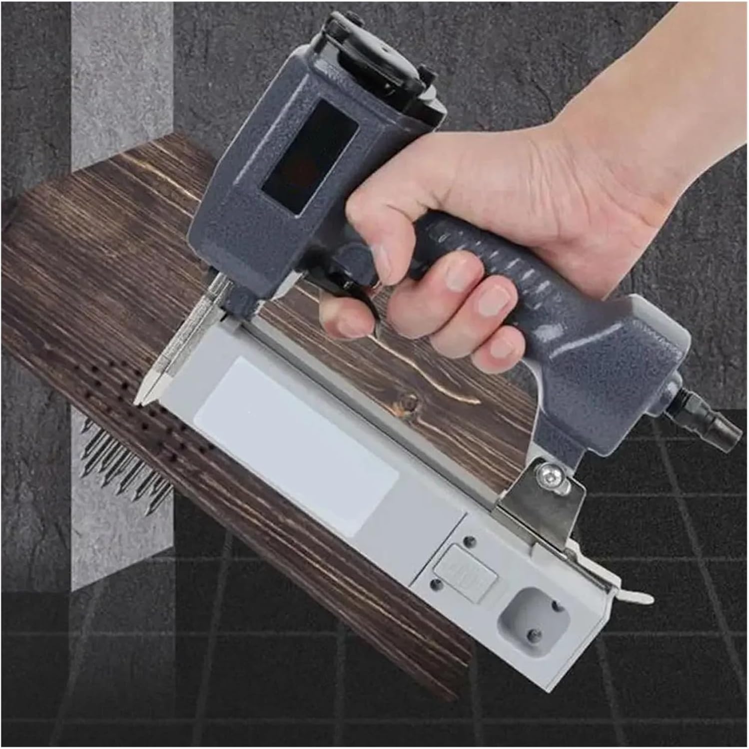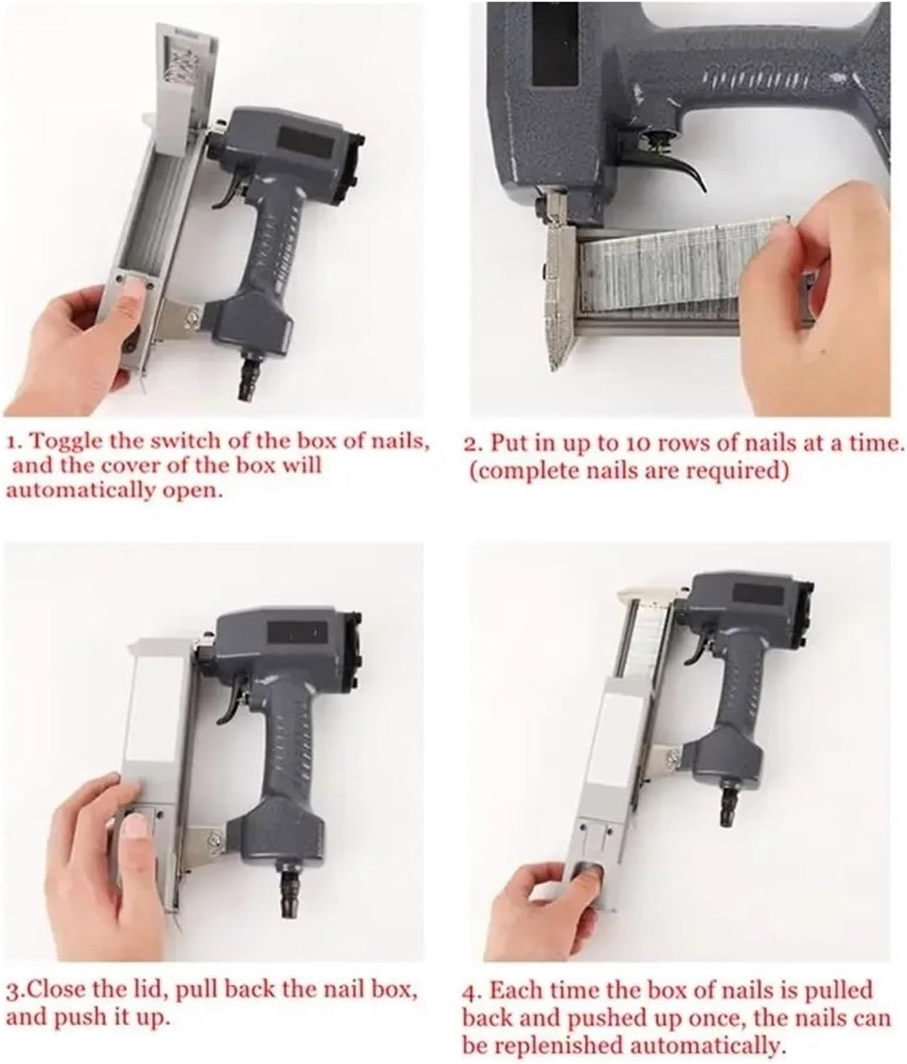 1. Equipped with a safety touch switch for rapid continuous firing, ensuring efficient and seamless without jamming, making nail driving quick and hassle .2. Streamline body design, Simple color design,nice-looking and pleasing to the eye ,Lightweight and portable, flexible and convenient,It also fit for operating in small space.3. Upper exhaust cover made of cast iron, Applicable to knocking at nails directly,Special striker design, stable and reliable qualitySpecification:Model: F30 Straight Nail GunNailer size: 240x60x165mmNail specification: 10-32mmNail Type: Straight NailTakeover size: 6mmWorking air pressure: 4-7kg/cm²Number of nail grooves: 1000 Scope of application: leather, sofa, woodworking, home decoration, etc.Packing list:1pcs Nail Gun( No Nails)or 1pcs Nail Gun1000 x Nails