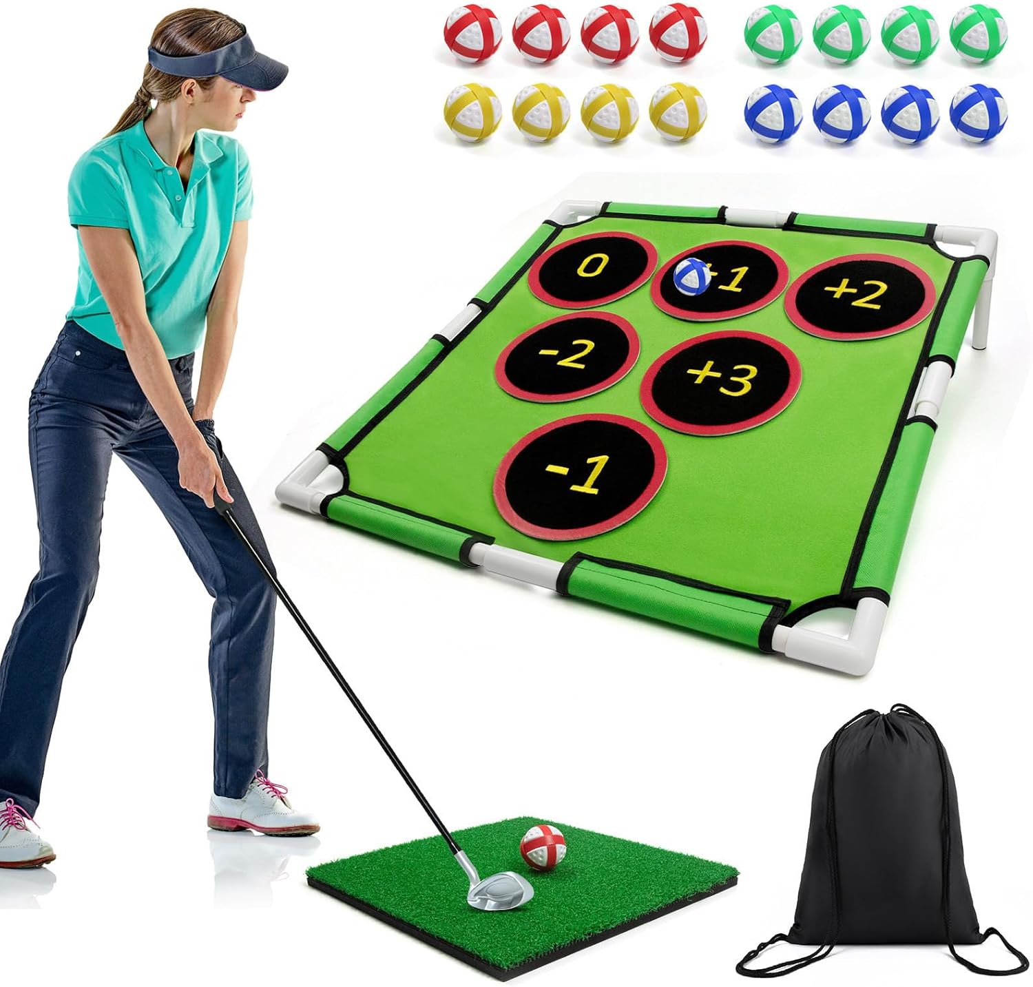 Transform any space into a golf practice zone with this versatile portable chipping game set! The comprehensive package includes a durable scoring board with numbered target zones, 16 colorful practice balls, a realistic hitting mat, and a convenient carrying bag for easy transport. Perfect for both indoor and outdoor use, this training game helps improve your short game accuracy and scoring skills. The scoring board features multiple target zones with different point values, adding an exciting competitive element to your practice sessions. Whether you're setting up in your office, backyard, or during break time, this compact set allows you to work on your golf skills anywhere. The included hitting mat provides a stable surface for consistent practice, while the lightweight design makes it easy to set up and store. Great for golfers of all skill levels looking to enhance their chipping precision and make practice more engaging. The set's portable nature and complete accessories make it an ideal choice for year-round golf practice and entertainment.