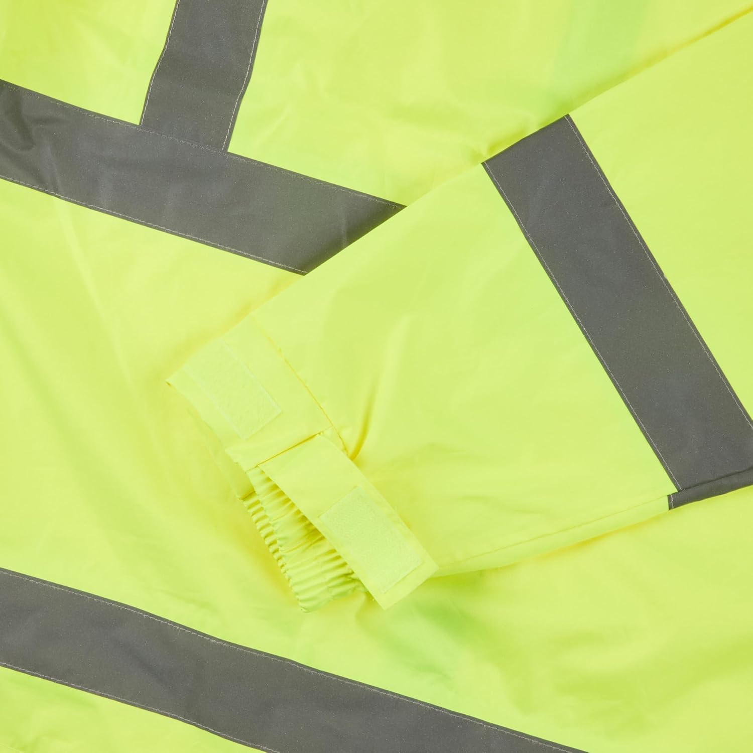 The Restaurantware Reflective Rain Jacket is designed to enhance worker safety and visibility in low-light and challenging conditions. Equipped with Class 3 reflective tape, this high visibility jacket is crafted from plastic, offering breathable and visible protection. Its 100% waterproof design, complete with a detachable hoodie and zipper front closure, ensures comfort and adaptability in various weather conditions. The jacket's dimensions are 30.98 x 25.98 inches, and it comes in a 1 count box, making it an essential single-piece safety wear for various professional settings.