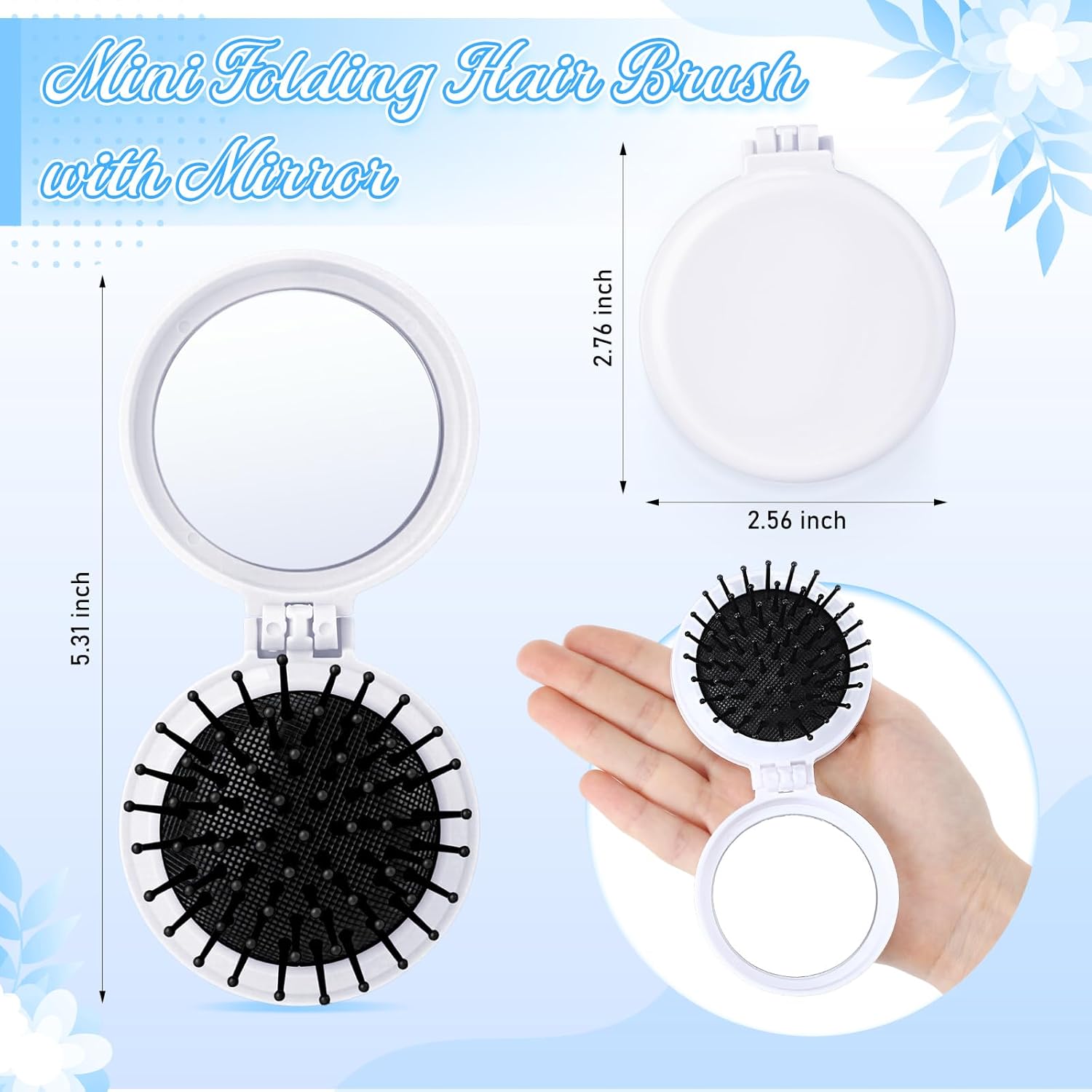 Features: This portable foldable mirror comb is mini size, easy to put into your handbag, carry at any time. Small hair brushes for hair is easy to comb and massage scalp. The mirror allows you to check your makeup. There are massage particles at the top of the comb, which can massage the scalp and reduce pressure. Specifications: Material: abs material Color: white Size: about 2.76 x 2.56 x 0.98 inches Package includes: 60 x mini folding hair brush Notes: Manual measurement, please allow slight errors on size. The color may exist a slight difference due to different screen displays.