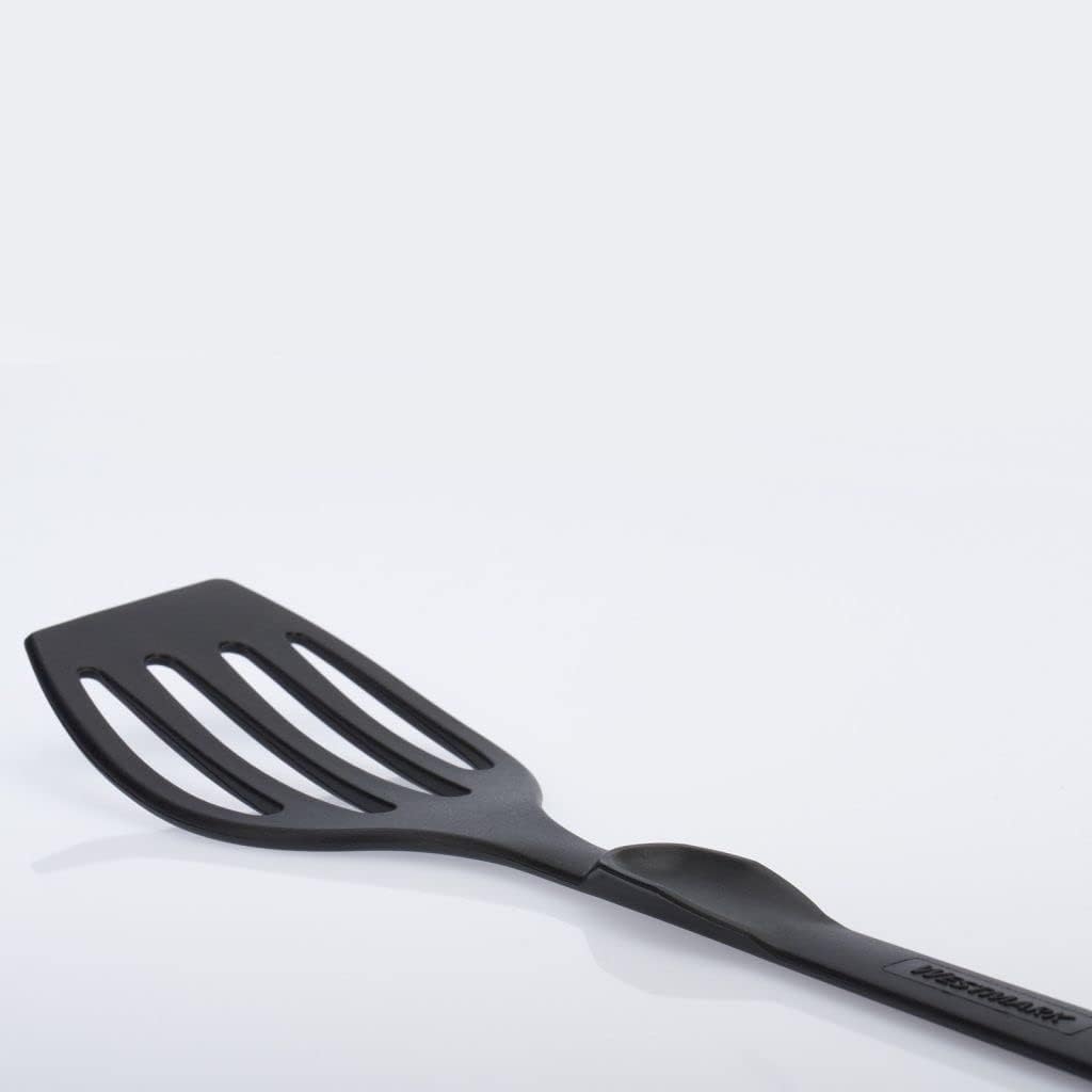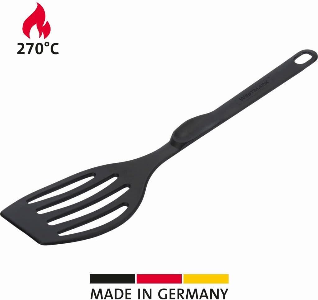 2 light and narrow slotted spatulas for turning your food in the pan and for serving at the table, thumb recess in the handle for a secure hold. No scratching of non-stick cookware thanks to plastic material, rounded spoon on one side for easy cutting of fried food in the pan. Comfortable hold and ergonomic work thanks to long handle, space-saving storage thanks to hanging eyelet, highly heat-resistant up to 270 °C. Made in Germany. –– – – Solid workmanship, easy to clean, dishwasher safe. Box contents: 2 x Westmark spatulas, Flonal Plus, material: plastic (PPA), colour: black, 203522E5