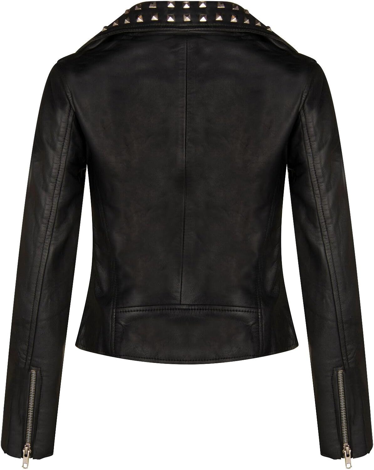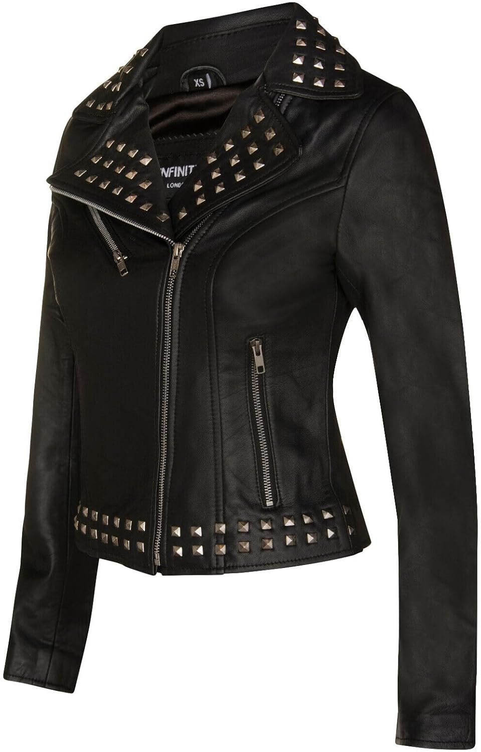 Elevate your style with our Women's Leather Biker Jacket, a timeless piece that combines classic elements with a touch of edge. Crafted from luxuriously soft leather, this jacket offers both comfort and bold sophistication. Wide notched lapels provide a strong, stylish presence. One breast zip pocket and two waist zip pockets offer functionality and a classic biker look. Interior satin lining ensures a smooth, comfortable fit. Silver studs on the lapel, collar, and hem of the jacket accentuate its edgy style. The soft leather not only looks great but also feels exceptionally comfortable against the skin. This jacket is the perfect choice to make a bold fashion statement, whether you're hitting the open road or stepping out on the town. Its combination of classic design elements and modern features make it a must-have addition to any wardrobe.